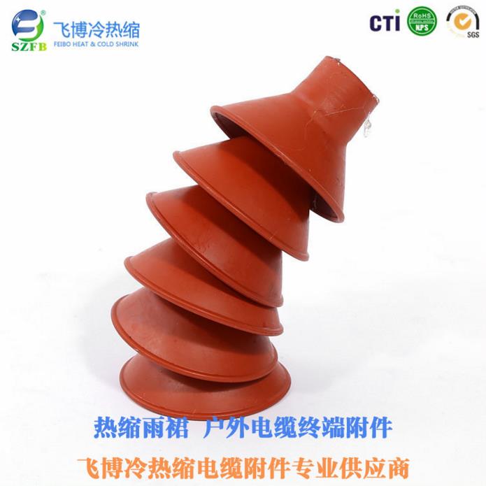 其次我們來說說10kv戶外電纜終端中的“戶外”,戶外的意思顧名思義就是室外,也就是說在室外使用的。由于耐壓級別的不同,10kv和35kv屬于高壓電纜終端,所以為了穩(wěn)定運(yùn)行又把電纜終端分為戶內(nèi)電纜終端與戶外電纜終端,這次我們所說的就是10kv戶外電纜終端。那么很多人又會對其有所疑問——戶內(nèi)戶外的區(qū)別在哪?其實(shí)戶內(nèi)戶外很大的區(qū)別之處就是戶外是有雨裙的,因?yàn)樵趹敉馐褂?,雨裙的很大作用就是防雨,有了雨裙的保護(hù)電纜終端在室外就能更加穩(wěn)定的運(yùn)行。當(dāng)然也可以從廠家附帶的產(chǎn)品配套表來區(qū)別戶內(nèi)戶外的不同。以下為10kv戶外電纜終端的雨裙圖: